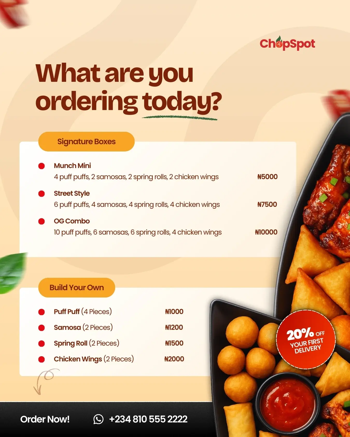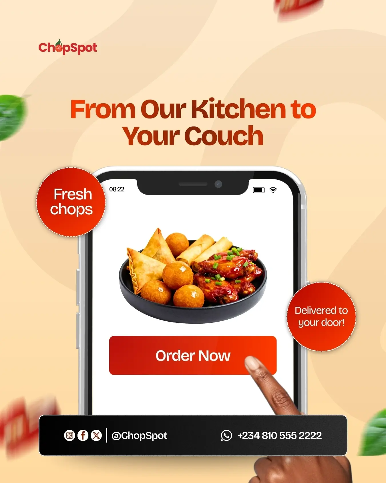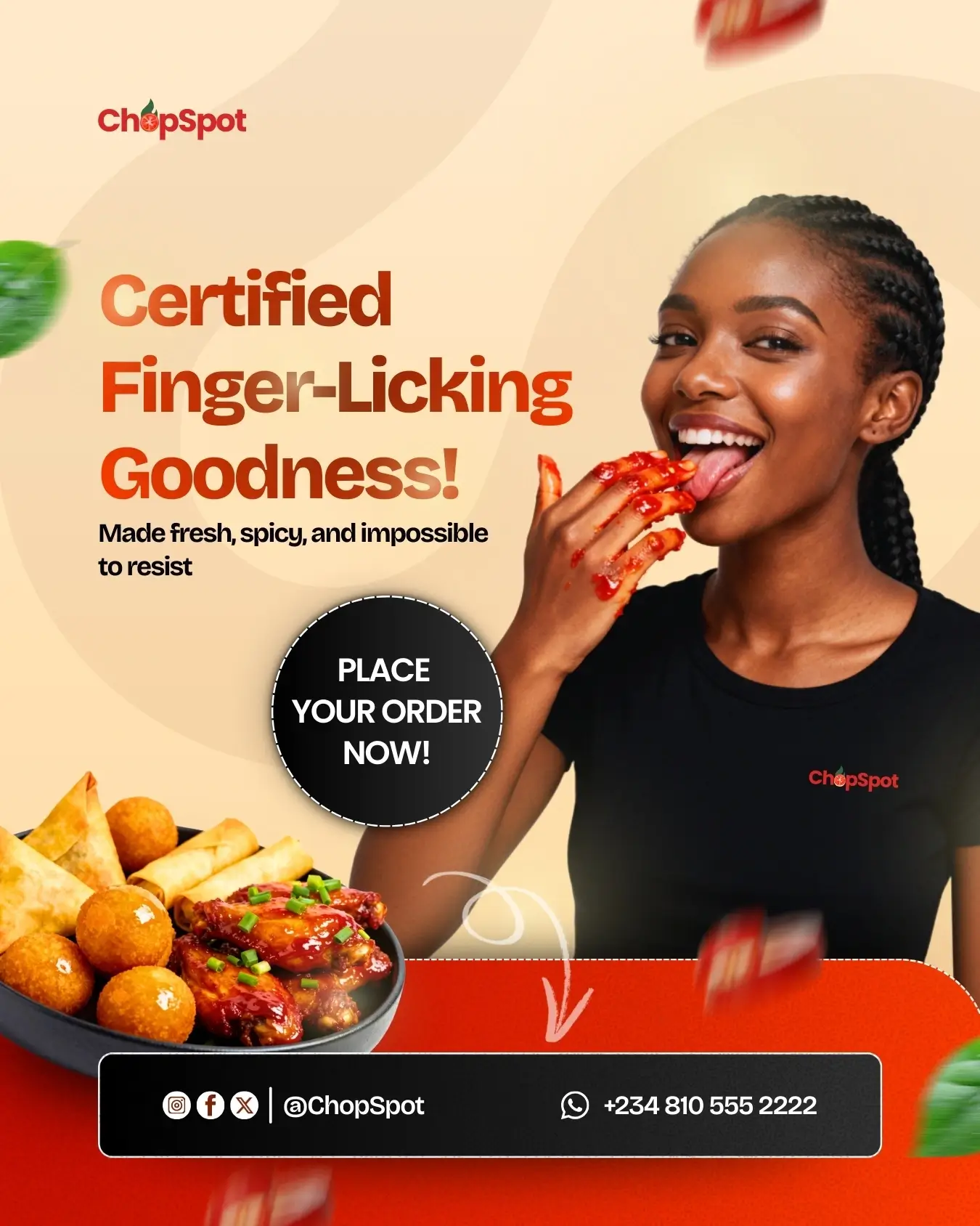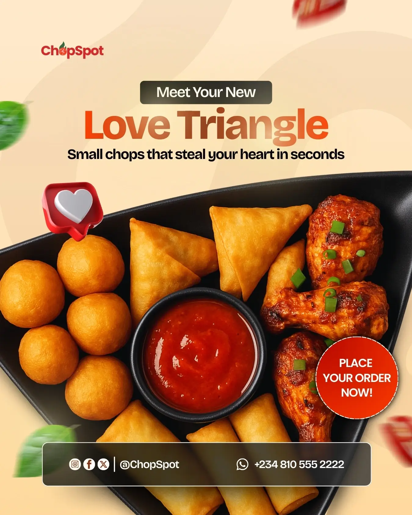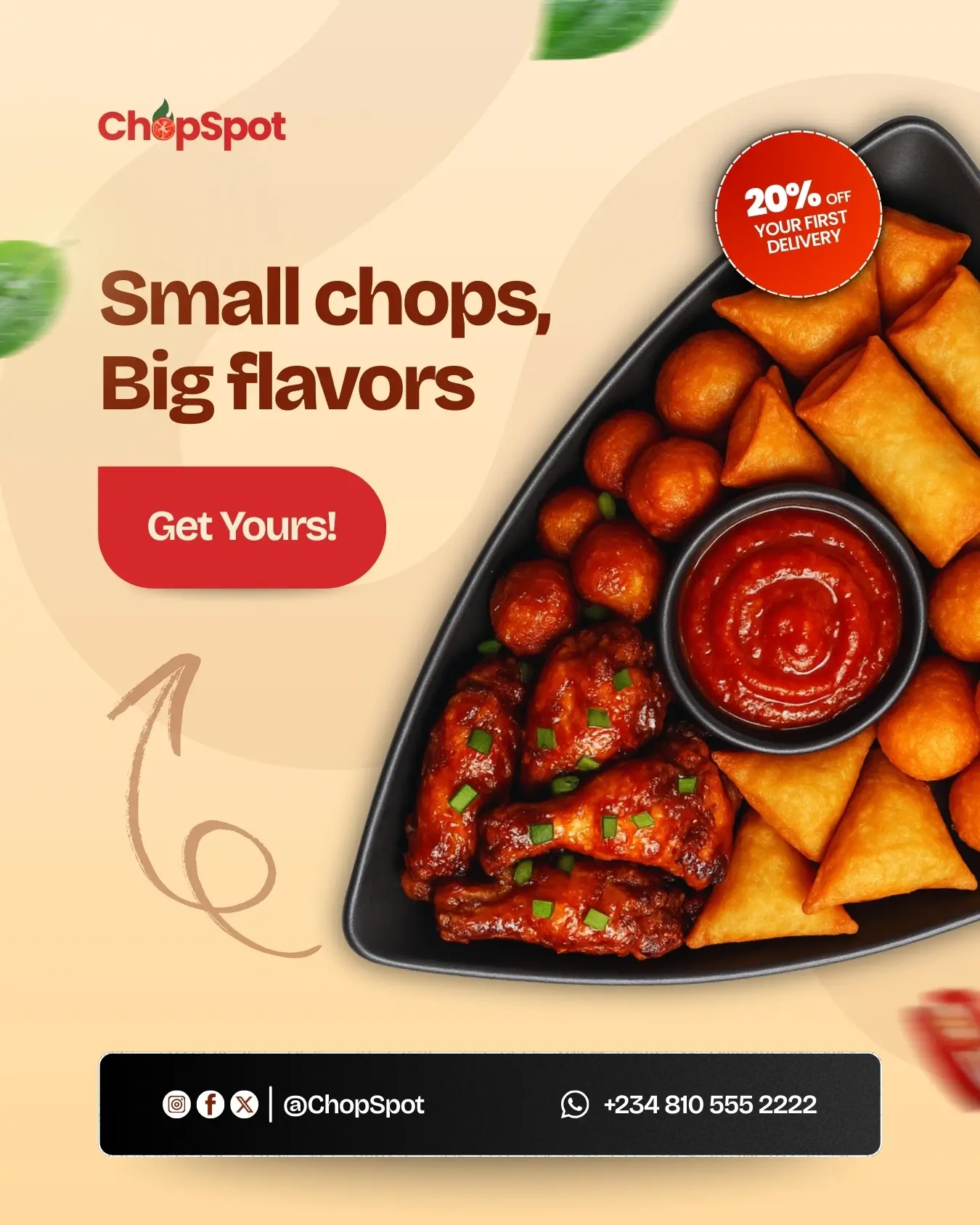 This project is a set of social media designs for ChopSpot, a food brand focused on fresh, flavorful small chops. The visuals are warm, appetizing, and designed to grab attention with bold food photography, friendly typography, and clear calls to action.